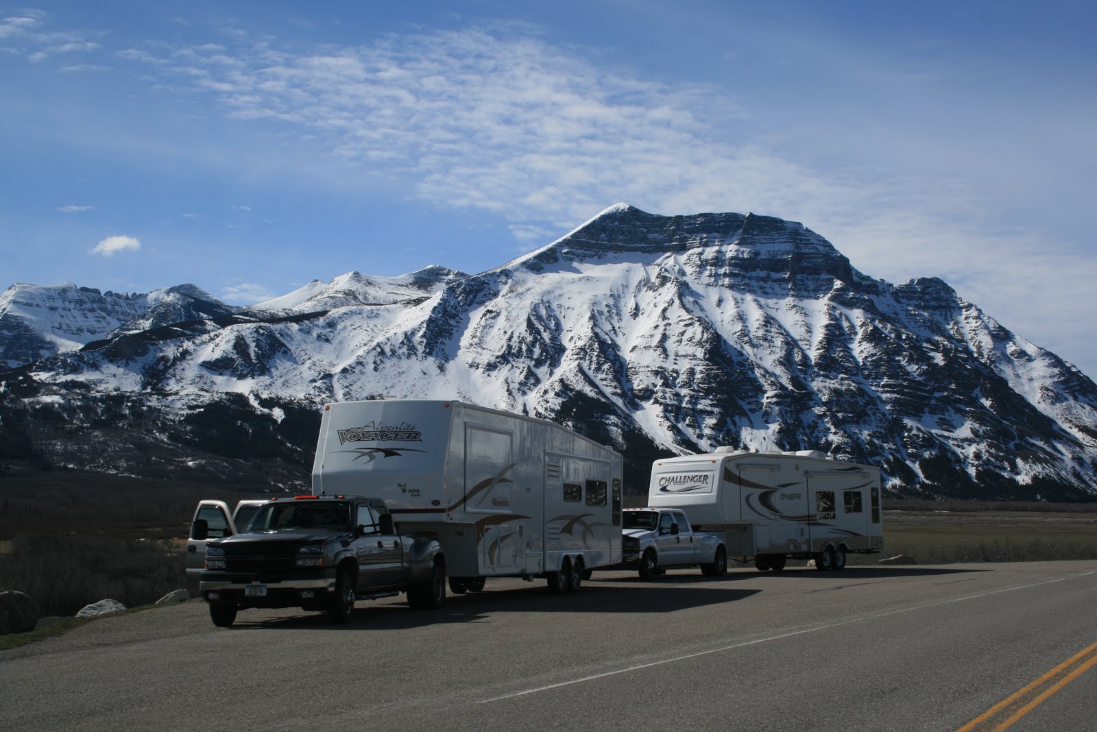 5/4,5,6,7, Day 37,37,38,39: Beautiful days drive north from Great Falls to Waterton Lakes National Park in southern Alberta. We had planned to cross the border at the ajoining Glacier National Park gateway. We navigated almost there only to find that the crossing was still closed. Snow. That meant a 30 mile detour to Cardston. Where we sailed through immigration & customs without having to get out of the truck or open the trailer. We were waved into Waterton Park no charge & rolled on into the village only to find that the campground was closed. Nobody at the gatehouse & gate open sooo we rolled on in. No services, no water but power turned on. We set up & were the only ones in the campground for the first night. Stayed for 4 nights & never had a visit from any staff looking for money. Great Deal. Spectacular scenery.Mile 3577